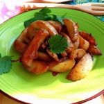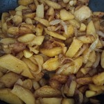 5. После того, как весь картофель нарезан и уже в сковороде, посыпать его порошком карри и перемешать. (Карри уже несколько лет находка для меня именно для жарки или запекания картофеля)