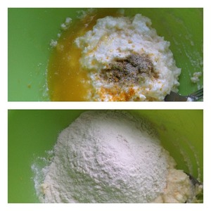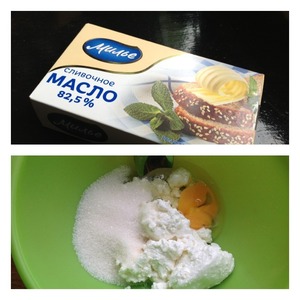 В миске смешать творог, яйцо, ванилин и сахар. Растереть ложкой. -