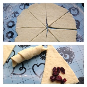Тесто разделить на две части. Рабочую поверхность присыпать мукой и из каждой части теста раскатать круг толщиной 1-1,5 см. Разрезать круг на сектора, как на фото. Можете сразу скрутить рогалики, а можно сделать с начинкой вашей любимой.