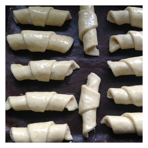 Рогалики выложить на противень, выстеленный силиконовым ковриком. Смазать наши булочки растительным маслом и отправить в духовку при 180*С - до готовности.