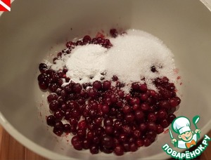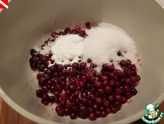 Для брусничного конфи я немного разморозила бруснику, смешала ее с сахаром и крахмалом (кукурузный обязательно!), немного пюрировала блендером.