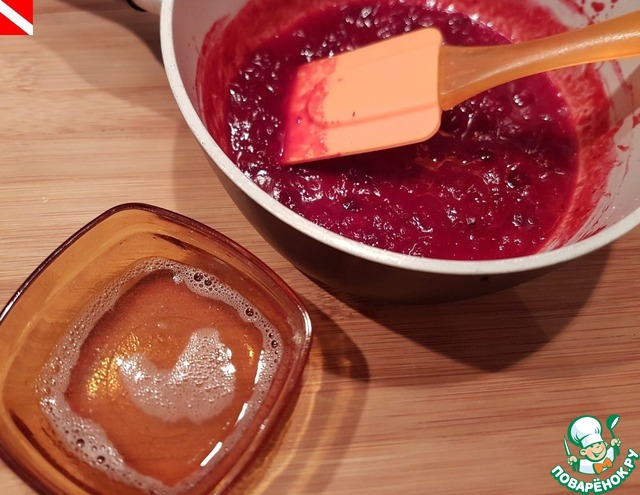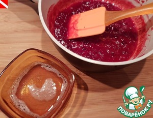 Затем поставить на огонь, варить до загустения массы. Желатин растопить удобным для вас способом - в микроволновке/на водяной бане. Влить в брусничное пюре, размешать и еще раз пробить блендером.