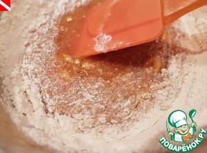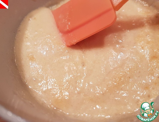 Снять с огня, добавить соду. Масса начнет пениться и станет карамельного цвета. Когда она немного остынет, добавить 1 яйцо комнатной температуры хорошенько размешать до однородной массы.