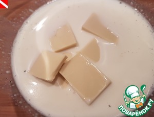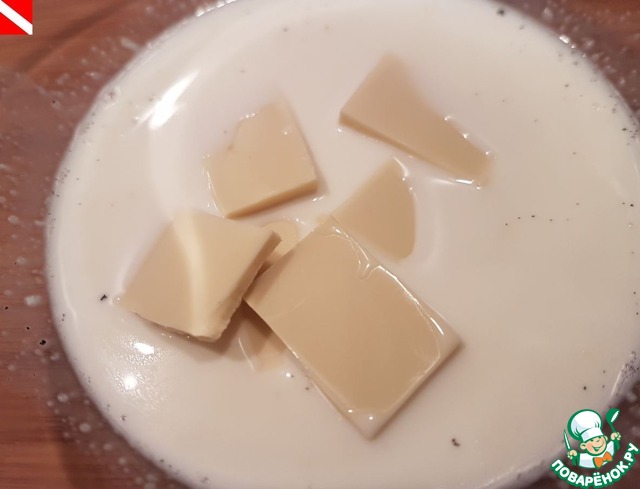 Ванильный мусс. Молоко и содержимое части ванильного стручка довести до кипения. Снять с огня, добавить распущенный желатин. Размешать. Добавить шоколад.