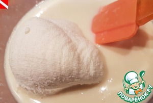 Смесь остудить до 60 градусов, ввести рикотту ( у меня домашняя, из подсырной сыворотки). Можно вместо рикотты использовать любой подобный сыр.