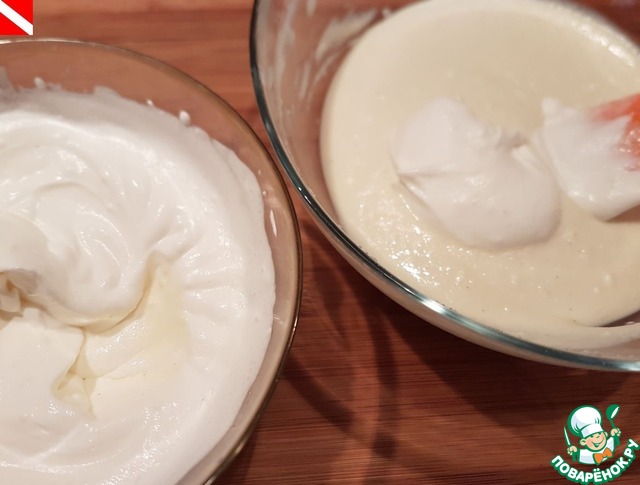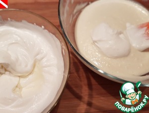Сливки взбить до мягких пиков и в несколько приемов вмешать их в молочно-сырную массу.