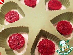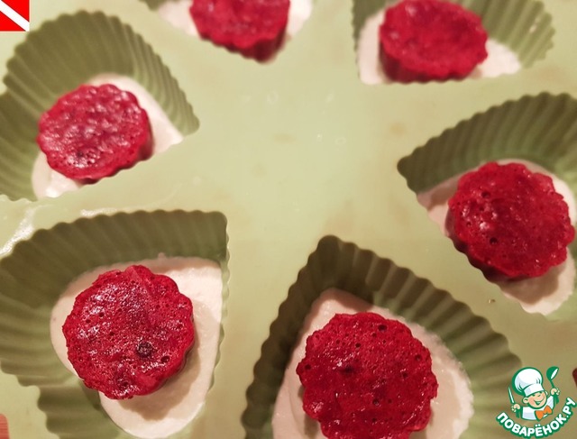 Сборка. Ванильный мусс переложить в кондитерский мешок, заполнить им дно формочек толщиной примерно 1 -1,5 см. Поставить на несколько минут в морозилку.