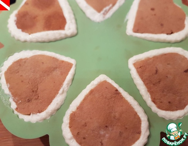 Заполнить формы остатками ванильного мусса. Сверху вдавить медовый бисквит. Убрать в морозилку до полного замораживания. Я делала вечером, оставляла в морозилке на ночь.