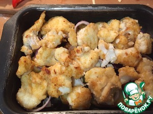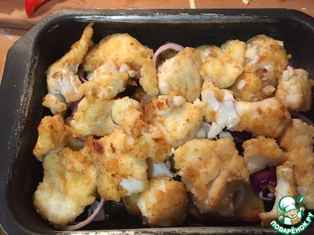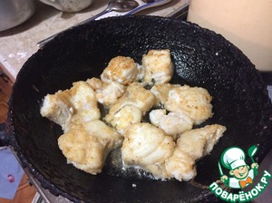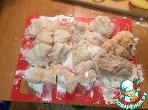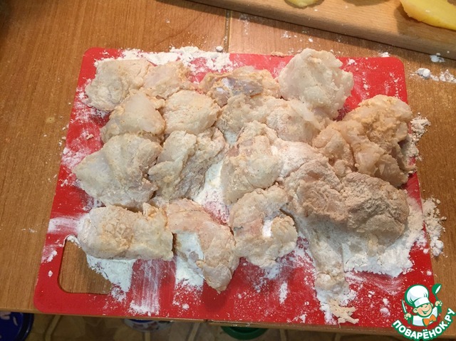 • Рыбу нарезать средними кусками, посолить, поперчить и обвалять в муке.
