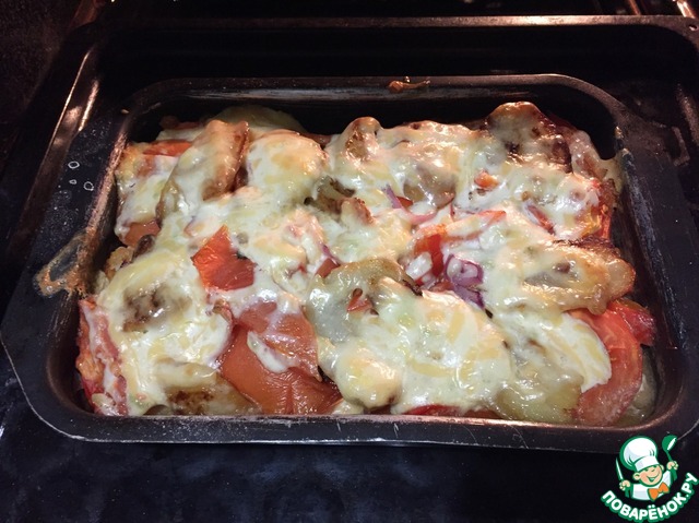 помидоры с перцем, картофель и сверху ещё раз смазать соусом.