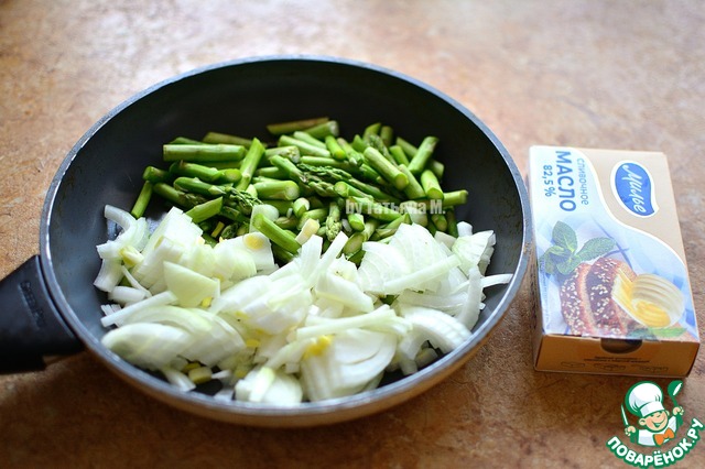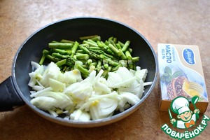 • Спаржу порезать произвольно, добавить рубленный лук, соевый соус и обжарить на сливочном масле до полу-готовности (при надобности можно подсолить, я не солила);