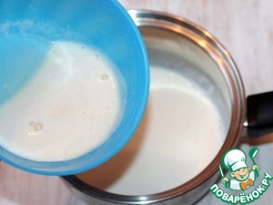 8. В сладкое молоко добавляем тонкой струйкой яичную смесь. Ставим кастрюлю на медленный огонь и периодически перемешиваем, чтобы крем немного загустел, 1-2 минуты. Снимаем кастрюлю с кремом с плиты.