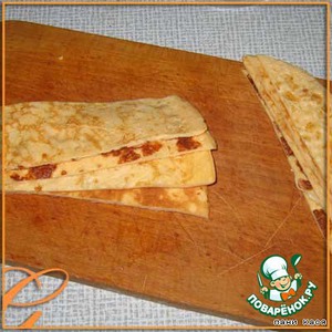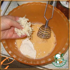 Делаем омлетные блинчики - на 1 яйцо кладем пару столовых ложек молока, неполную столовую ложку муки, солим, взбиваем, добавляем тертый сыр, аккуратно перемешиваем,