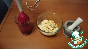 Ягоды взбиваем в блендере, нарезаем мелко фрукты, измельчаем орехи в ступке. Половину орехов добавляем в миску с фруктами.