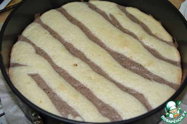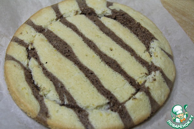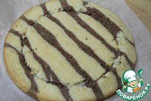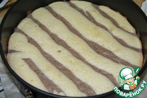 Темное и светлое тесто пометить в корнетики и выдавить полосками в форму, застеленную бумагой для выпечки.