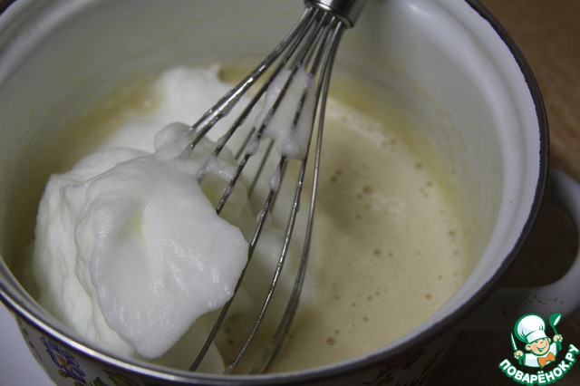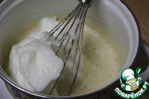 Белки взбить с оставшимся сахаром в крепкую пену. Смешать с желтками.