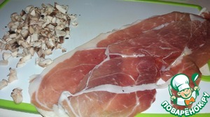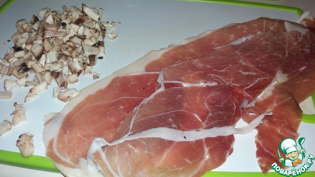 • Грибные ножки порезать, ветчинные слайсы разрезать пополам.