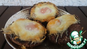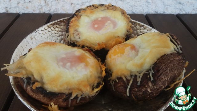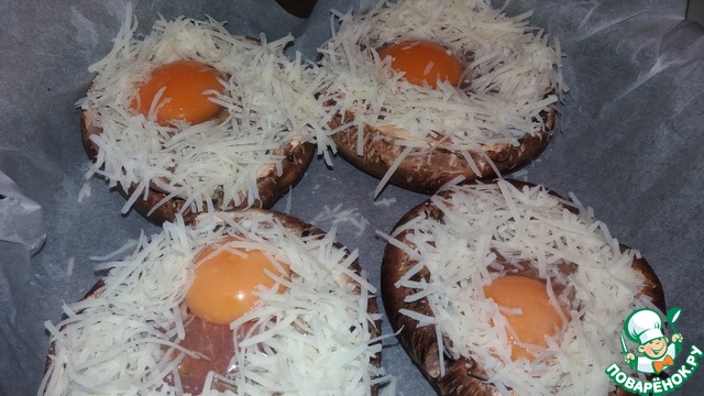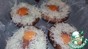 • Разбиваем яйца в центр грибов, не повредив желтка.