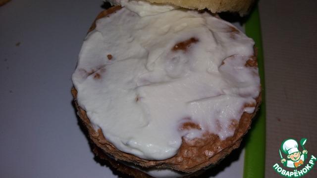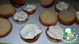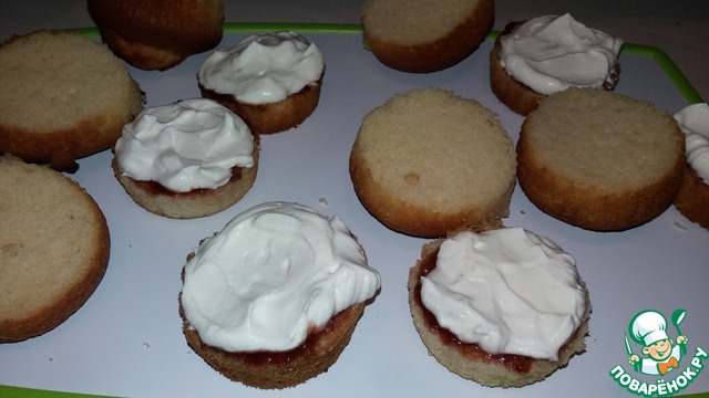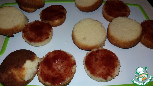 Теперь, когда все готово, собираем пирожное. Маффин разрезаем пополам, смазываем 1 или обе половинки клубничным джемом.