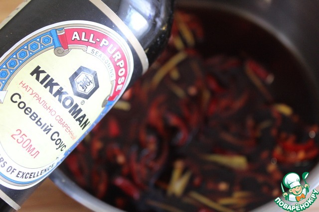 Выложить в сотейник имбирь и перец, влить соевый соус, добавить уксус и довести до кипения, варить пару минут.