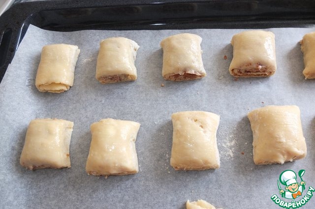 Тесто выкладываем на подпыленную мукой поверхность, раскатываем, смазываем белком, посыпаем измельченными орехами, корицей и ванильным сахаром. -