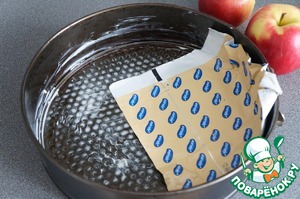 Половину теста выложить в форму. Сверху натёртые яблоки. Присыпать корицей.