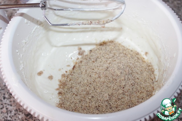 Взбиваем рикотту, добавляем сахар, йогурт, ванилин и перемешиваем. Добавляем молотый фундук. -