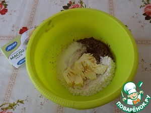 В чашку просеиваем муку.. Добавляем соль, оставшийся сахар, ванилин и какао-порошок. Добавляем сливочное масло. Я использую масло ТМ "Милье".