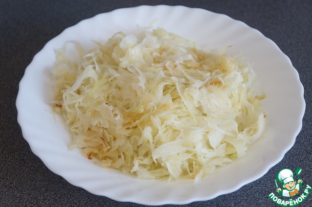 Для начинки капусту тонко нашинковать. Сложить в сотейник или сковороду, добавить масло, соль, влить воду. Тушить капусту на небольшом огне периодически помешивая до выпаривания воды.