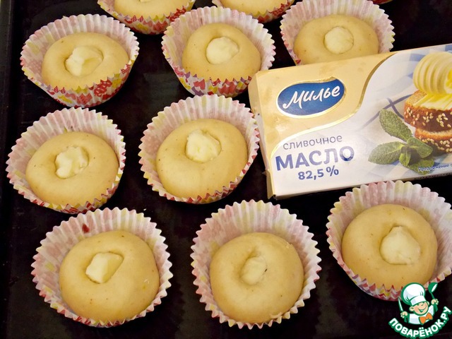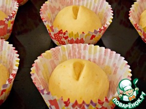 Разделить тесто на 15 одинаковых кусочков и скатать шарики, уложить в бумажные формочки. Ножницами надрезать верх булочек.
