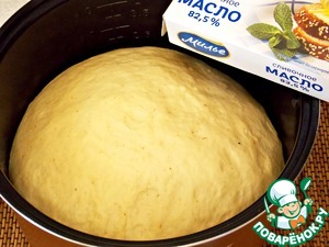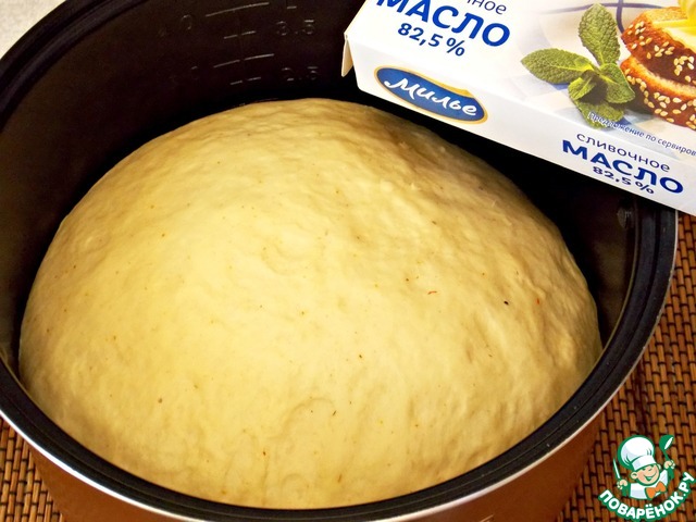 Молоко немного нагреть, добавить мягкое масло ТМ "Милье", молотый шафран, дрожжи, яйца, сахар, соль и размешать до однородной массы. Добавить муку частями и замесить мягкое тесто. Поставить на расстойку. Для этого я использую мультиварку. В режиме "МУЛЬТИПОВАР" установить t=35 и время 45-50 мин. Или накрыть полотенцем и поставить в теплое место на 50-60 мин.
