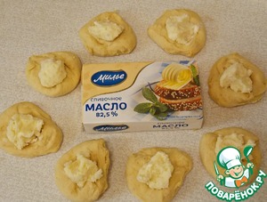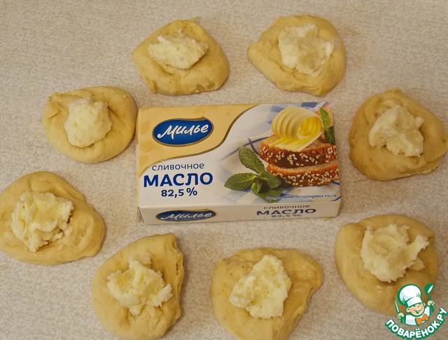 Тесто разделить на 28-30 одинаковых кусочков, раскатать в небольшие лепешки, разложить начинку.
