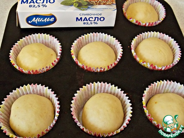 Хорошенько собрать края и защипать, придавая форму шара. Укладываем в бумажные формы. Смазать верх сладким чаем.