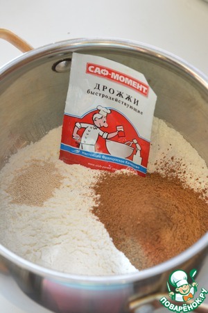 Смешайте оба вида муки, добавьте солод и дрожжи (быстродействующие Саф-момент). Сюда же добавьте соль и мёд