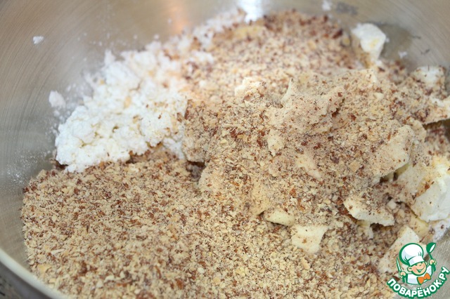 Выложить в миску муку, творог, кубики сливочного масла и орехи.