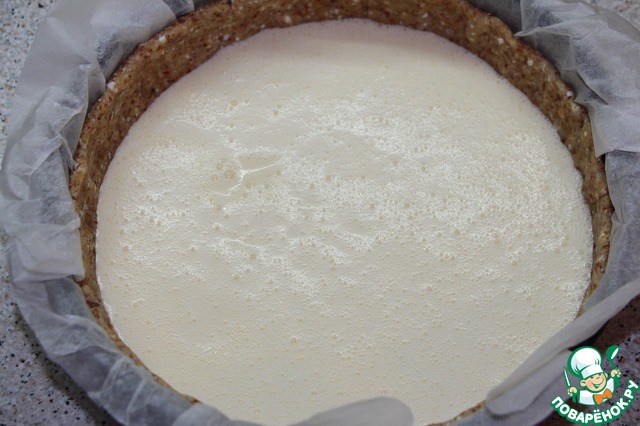 Тесто выложить в форму, выстеленную бумагой для выпечки, сформировать высокие бортики, ровненько обрезать поверху.