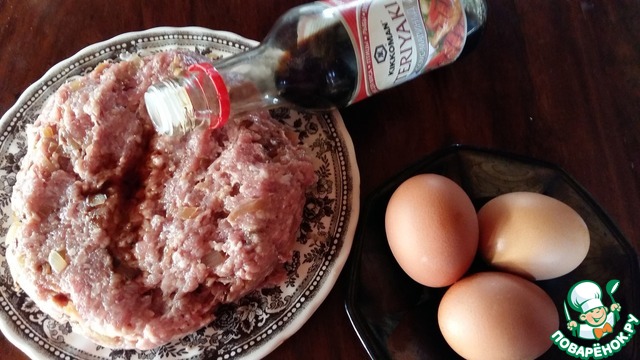 Приготовить фарш. У меня сегодня смешанный свинина-говядина. Луковицу обжарить на растительном масле, посолить и поперчить. Соединить с мясом, замоченным в молоке кусочном белого хлеба, и приправить фарш 1 ст. л. соуса-маринада "Терияки" от ТМ "Киккоман".
