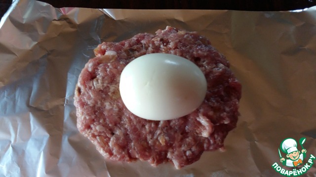 Яйца отварить в крутую. Из фарша на ладони сформировать лепешку, выложить по центру яйцо и завернуть его в фарш со всех сторон. Каждое, подготовленное таким образом гнездышко, завернуть в фольгу.