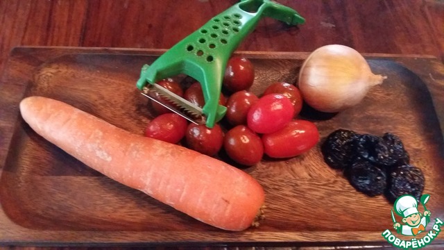 А это набор овощей для гарнира. На фото предательски не попал болгарский перец. Морковь натереть на терке для корейской моркови, помидорки порезать пополам, перец, лук и чернослив тонкими ломтиками. Морковь и лук быстро обжарить на большом огне с добавлением 1 ст. ложки соуса-маринада "Терияки" от ТМ "Киккоман" почти до готовности. Затем добавить чернослив, помидоры, паприку и 2 ст. л. томатного соуса, все перемешать и прогреть буквально 1 минуту, что бы вкусы соединились.
