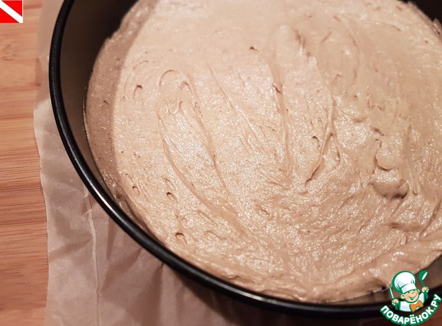 Дно разъемной формы (диаметр 20 см) проложить пергаментной бумагой. Вылить тесто, выпекать 30-35 минут в разогретой до 165 градусов духовке. Готовность проверить шпажкой.