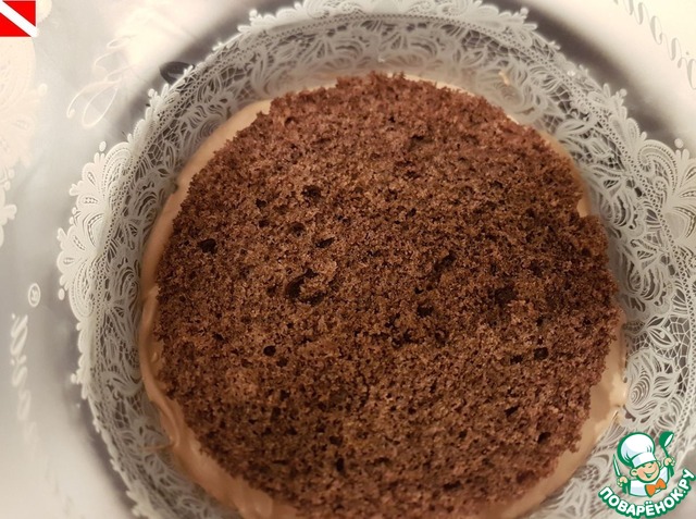 На доску уложить пищевую пленку, поставить разъемную форму, края пленки закрепить на форме. Поставить бортики, т. к. торт будет высоким чуть более 10 см. На дно нашей конструкции налить слой 1-1,5 см шоколадного мусса, немного подморозить (5 мин). Уложить 1 корж бисквита. Налить еще слой шоколадного мусса, опять подморозить. -