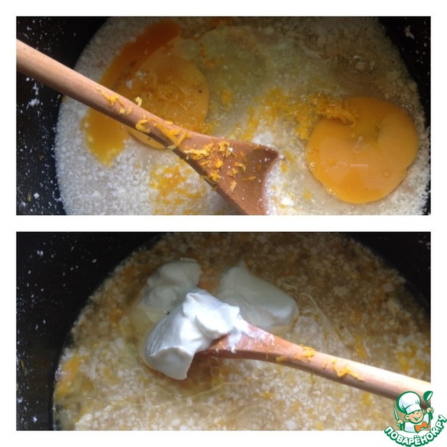 Добавить яйца и цедру. Перемешать. Влить масло и выложить сметану, взбить венчиком секунд 10.