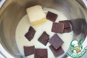 Сгущенку, масло и 50 г шоколада соединяем в кастрюльке. Ставим на небольшой огонь, постоянно помешиваем, доводим до однородной гладкой массы.