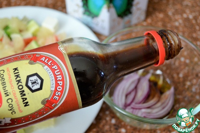 Лук нарезать перьями, влить соевый соус. Я использую сладкий натурально сваренный соевый соус от ТМ Киккоман. Перемешать.