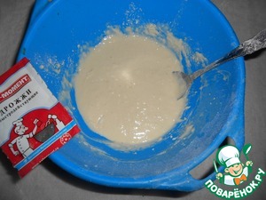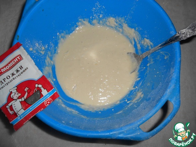 В теплое молоко (125 мл) добавить дрожжи, перемешать. Добавить просеянную муку, накрыть полотенцем и оставить на 1 час.