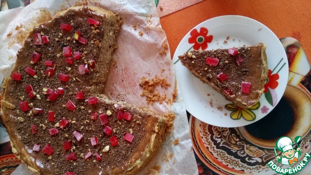 Разъемную форму для запекания застелить пекарской бумагой. Выложить полученную массу на дно формы и утрамбовать поверхность. Форму отправить в холодильник примерно на 20 минут.
