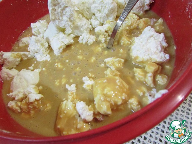 Ввести мягкий творог (если у вас обычный творог, пропустить его через мелкое сито). Массу пробить миксером.