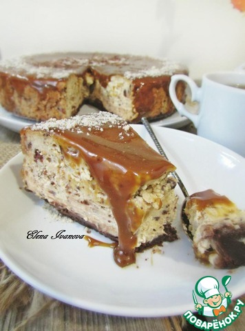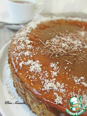 В сотейнике довести до кипения (до состояния глазури) вареное сгущенное молоко (карамель). Горячую карамель вылить на чизкейк. Дать остыть. Поставить в холодильник на ночь.