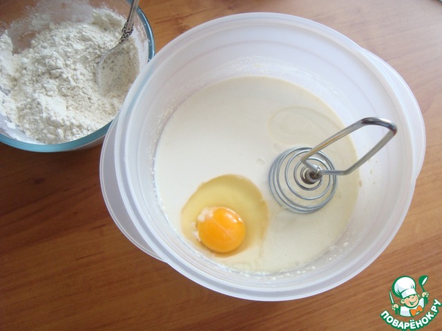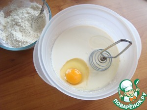 Достала опару, долила оставшееся молоко и разбила туда яйцо, налила подсолнечного масла и венчиком, постоянно помешивая добавила муку.