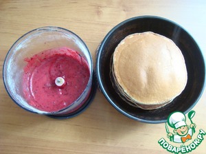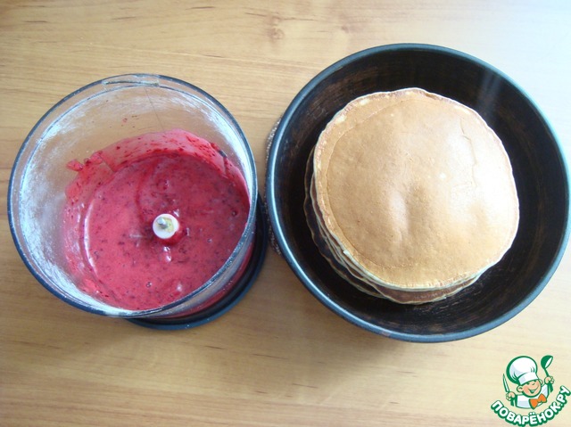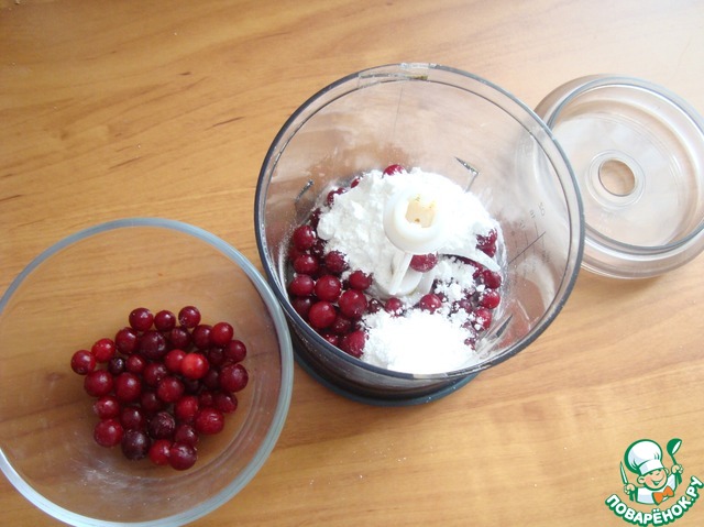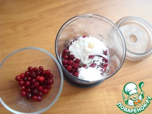 Пока жарились блины, сделала клюквенный, простой соус. Разморозила клюкву и разбила её в блендере с сахарной пудрой.